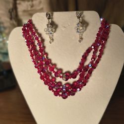 Vintage Triple Strand Red Aurora Borealis Glass Stones Necklace With Clear Crystal Dangling Glass Earrings$45Las Vegas, Nevada