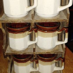 Vintage Wooden Coffee Mug Display Case w/ 6 Stoneware Mugs Wall Hanging Shelf$50Sun Valley, NV