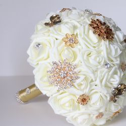 Brooch Bouquet - Ivory Roses With Gold Jewels $80The Bronx, NY