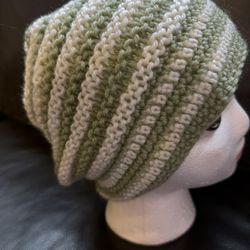 Handmade Knit Crochet Slouch Hat Green White Striped Soft Lightweight Beanie $15New City, NY