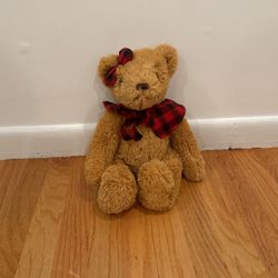 Brown Teddy Bear About One Foot Tall With a Red And Black Squared Scarf And Bow$5Hawthorne, NJ