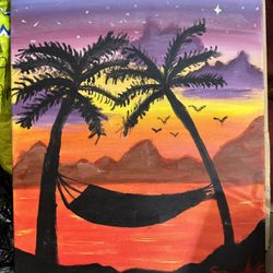 Hand-Painted Canvas Sunset Scene with Palm Trees and Hammock$45New York, NY
