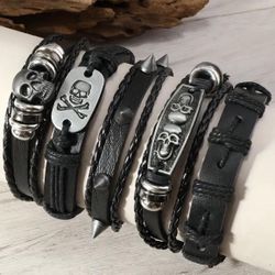5 PCs Gothic PU Leather Skull head Bracelets - Punk Grunge Black wristbands - Faux Leather Jewelry Skull Head Patterns Design - Men Women Unisex $12New York, NY