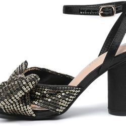 Women's Sequin Block Gold/Black Heel Sandal – 3.7" Bowknot Ankle Strap Shoes, Size 7$25Franklin Square, NY