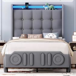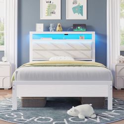 Queen Bed Frame With Ergonomic Headboard & Storage Shelf, Wood Platform Bed Frame with Lights, Outlets & USB, Off-white$100Edison, NJ