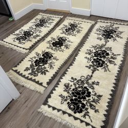 Set of 3 Handmade Jambolija Sheepskin Wool Runner Rugs – Vintage Floral Black & Cream (Various Sizes)$375New York, NY