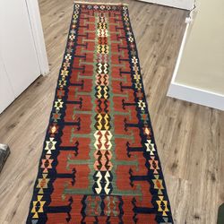 Vintage Handwoven Turkish Kilim Runner Rug – Tribal Wool Hallway Runner – Red Navy Geometric$250New York, NY