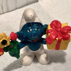 Vtg. 1978 Smurf PVC Figurine w/ Gift + Flower Schleich Peyo Hong Kong 2”$5Garden City P, NY