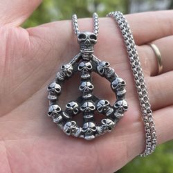 Mens Cool Hippie Biker Peace Sign Punk Skull Stainless Steel Pendant Necklace $23Queens, NY