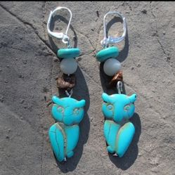 Turquoise Owl Tigers Eye & Amazonite Dangle Drop Earrings Silver Plated Hook $40Wadsworth, NY
