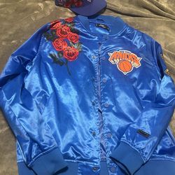 Cool PRO New York Knicks matching set! Blue satin bomber jacket has awesome red roses design on front and back. Jacket is size L Snapback hat also has$350Glenville, NY