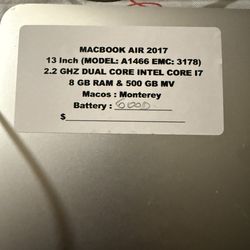 MacBook Air ( 13 Inch ,2017 ) 2.2 GHZ Dual Core Intel Core I7 8 GB Ram & 500 GB MV$200Little Falls, NJ
