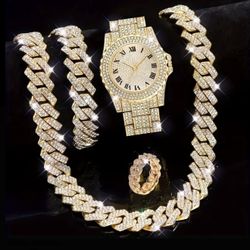 Iced Out Gold Tone Watch Necklace Bracelet Ring Set$30Jamaica, NY