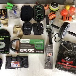Preowned Group Of Exercise / Gym Equipment Leg Weights Fascia Balls Phone Tripod Ab Slings Etc.$45Garden City P, NY
