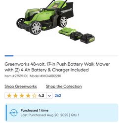 Greenworks 48-volt, 17-in Push Battery Walk Mower with (2) 4 Ah Battery & Charger Included$225Syracuse, NY