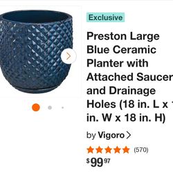 Vigoro Preston Large Blue Ceramic Planter with Attached Saucer and Drainage Holes (18L x 18W x 18H)$75Poughkeepsie, NY