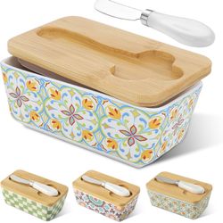 New-Butter Dish with Lid, Large Butter Dish for Countertop, Bohemian Ceramic Butter Keeper Container with Knife and Bamboo Lid, Butter Holder for Coun$15Queens, NY