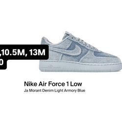 Sizes 10M, 10.5M, & 13M Nike Air Force 1 Low Ja Morant Denim Light Armory Blue$200Levittown, NY