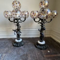 Pair of Vintage Cherub Marble Lamps - Coin Dot Glass Globes / Hollywood R Style$950New York, NY