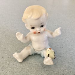 Vtg. 1950s Baby Boy w/ Yellow Hair + Bird Figurine / Cake Topper 3.5” Porcelain $5Garden City P, NY