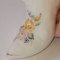 Vintage Fenton Rose Slipper in Satin White, Pink w Hand Painted Flowers, Signed