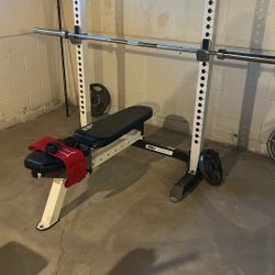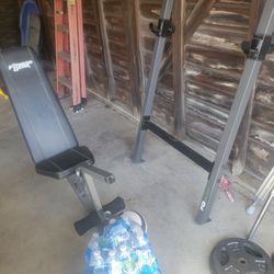 205 Lbs of Golds Gym Weights/ 45 Lb Olympic Bar/ 2 Benches/ One Easy Curl Bar/ 2 Dumbbell Bars Adjustable/ 10 Clips/ Squat Rack/another bench bar/ 15$850Independence, OH