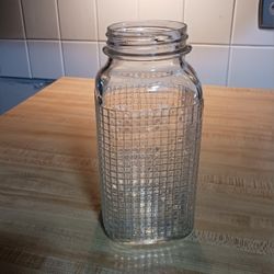 VINTAGE SQUARE GLASS CANNING JAR WITH EMBOSSED WAFFLE GRID PATTERN 8" x 3 1/2"$6Akron, OH