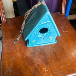 This is a Rae Dunn ceramic birdhouse in blue or aqua with a jute cord for hanging. $30Amelia, OH