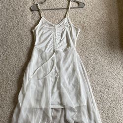 Short, Sleeveless White Prom Dress with Black Floral Accents and Sheer Black Scarf$80Mason, OH