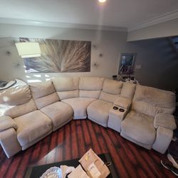 Suede sectional sofa with 3 recliners, storage, cup holders and USB ports.