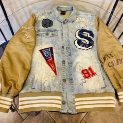 Smoke Rise Men's Varsity Denim and Nylon Jacket. It is a light-wash denim jacket. 2XL$55Columbus, OH