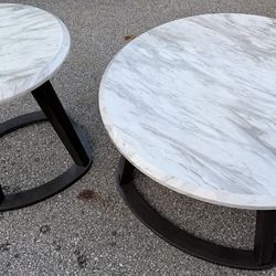 Set Of Two Round Marble Patter Stone Coffee + Side Table With Wood Base$100Westerville, OH
