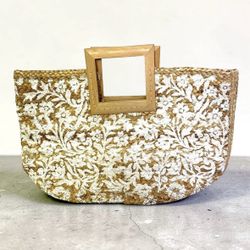 Woven Straw Tote Bag Wooden Handle White Floral Pattern Beach Boho$20Columbus, OH