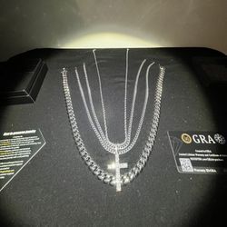 Sliver And Vvs moissanite Bundle. Cuban Link Chain 21 inches With Pendant, Cuban Link Bracelet 7 1/2 Inches, Sliver 18in Herringbone Chain. $850Columbus, OH