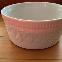 CRATE & BARREL. ROUND CERAMIC CASSEROLE DISH. EMBOSSED FRUIT DECOR. 8.5” X 4”. NEW$35Centerville, OH