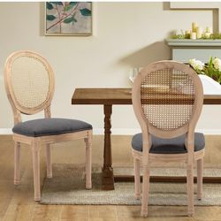 French Country Dining Chairs Set Of 2, Upholstered Chairs With Nature Rattan Round Back, Wire Drawing And Carving Techniques, Disassemblable, For Livi$80Huber Heights, OH