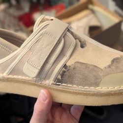 Clarks Originals Men's Trek Taiyo slip-on sneaker in an off-white camouflage pattern with a natural crepe rubber sole. $30Dayton, OH