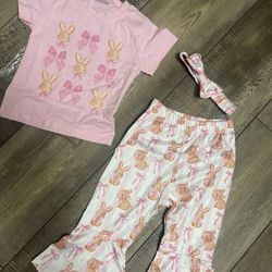 Easter Toddler Baby Girl Outfits Bunny Embroidery Long Sleeve Sweatshirt + Bow Print Flare Pants Easter Clothes $9Centerville, OH