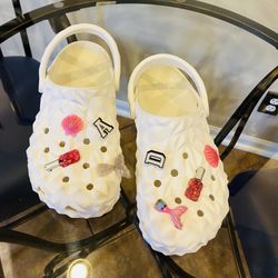 Clean white Crocs clogs. Womens size 8, mens size 6. Comes with super cute Jibbitz charms attached. Has a mermaid tail, nail polish bottle, seashell, $20Columbus, OH