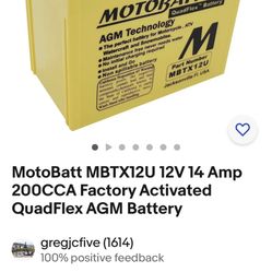 MotoBatt MBTX12U 12V 14 Amp 200CCA Factory Activated QuadFlex AGM Battery$60Brunswick, OH
