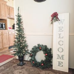 4 1/2 FT. PRELIT ARTIFICIAL CHRISTMAS TREE, WREATH & WOODEN "WELCOME " SIGN$15Ravenna, OH