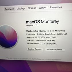 2015 15.4” Apple MacBook Pro i7 Quad Core 16GB RAM 256GB SSD macOS Monterey Retina EXCELLENT$649Medina, OH