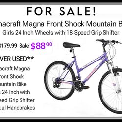 Dynacraft Magna Front Shock Mountain Bike Girls 24 Inch, 18 Speed, Purple -Great Christmas gift! $88Youngstown, OH