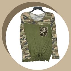 12 PM By Mon Ami Olive & Camo Tie Front Shirt w Netted Sequins Pocket Shirt Women M$14Choctaw, OK