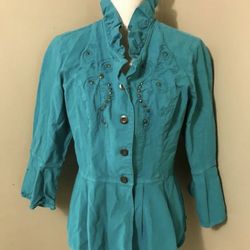 Gretty Zueger Teal Green Ruffle Studded Embroidered Jacket Boho Bell Sleeves L$24Portland, OR