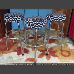 Set of 3 MCM Style Barstools - 29"H x 14"diameter Seat Black and white patterns fabric seat , steel metal legs$200Portland, OR