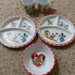 Vintage 1984 Disney Mickey Minnie Donald Daisy Goofy Pluto Baby Child's Cup, Plate, And Bowl Selandia Designs