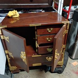 1970 chinoiserie burl wood cabinet W brass mounts and side handles$900Portland, OR