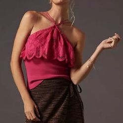 Anthropologie Eyelet Halter Top Magenta Pink Ribbed Knit Scalloped Lace Large$33Portland, OR