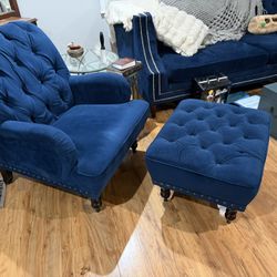 Velvet Blue, Tufted, Armchair, And Ottoman$50Boring, OR